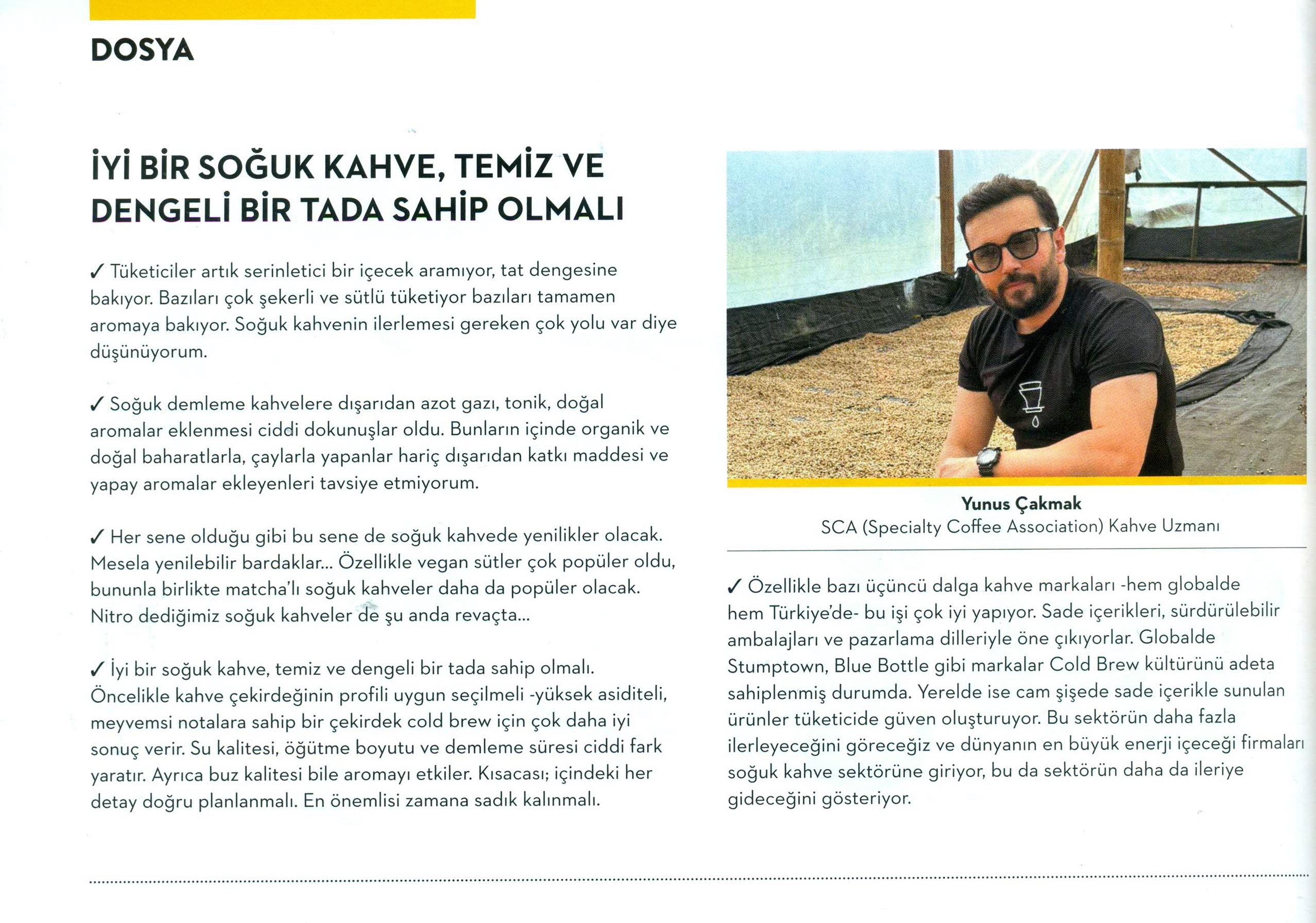 Derginin “İyi Bir Soğuk Kahve, Temiz ve Dengeli Bir Tada Sahip Olmalı” başlıklı dosyasında, soğuk kahve kültürüne dair önemli değerlendirmelerde bulunan Çakmak, tüketici alışkanlıklarından yeni trend ürünlere, doğru kahve çekirdeği seçiminden demleme tekniklerine kadar pek çok konuya değindi.